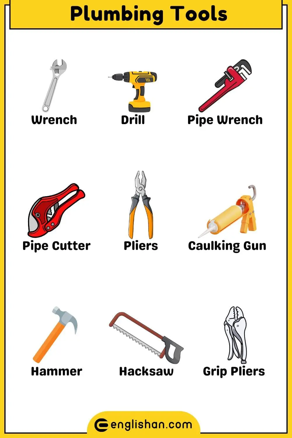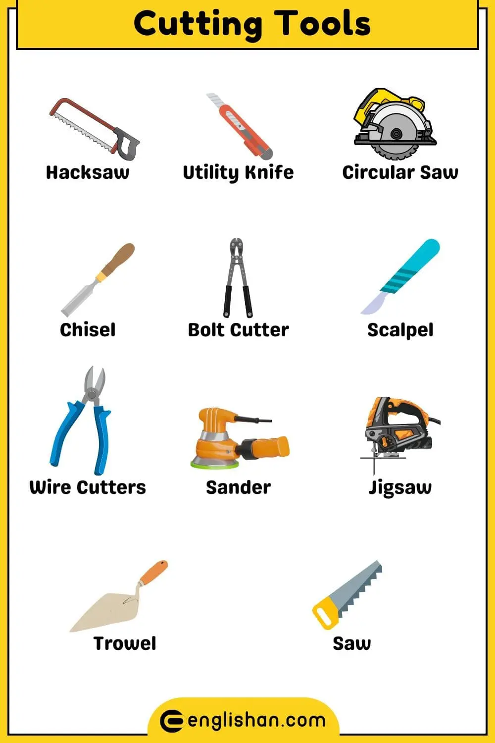 Tools are used for building, repairing, and fixing things in daily life. In this blog post, you will learn 105 tool names in English with pictures, making it easy to recognize and remember them. From hand tools to power tools, this list will help you improve your English vocabulary while understanding different tools used in construction, mechanics, and home repairs.