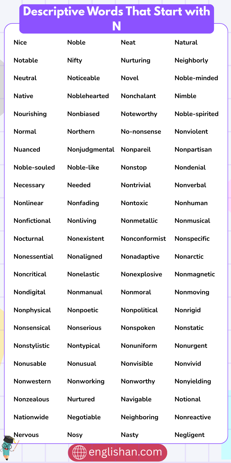 Words like “noble,” “nurturing,” and “neat” are words that start with N to describe someone, often chosen to show kindness, strength, or admirable traits. They make your descriptions sound more thoughtful and positive in English.